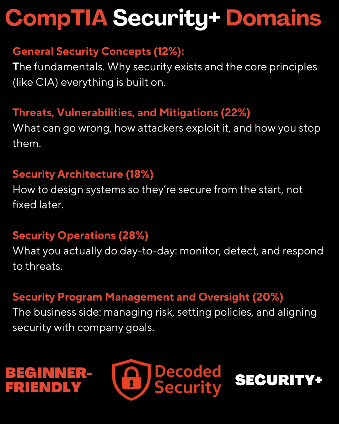 General Security Concepts (12%) → The fundamentals. Why security exists and the core principles (like CIA) everything is built on.