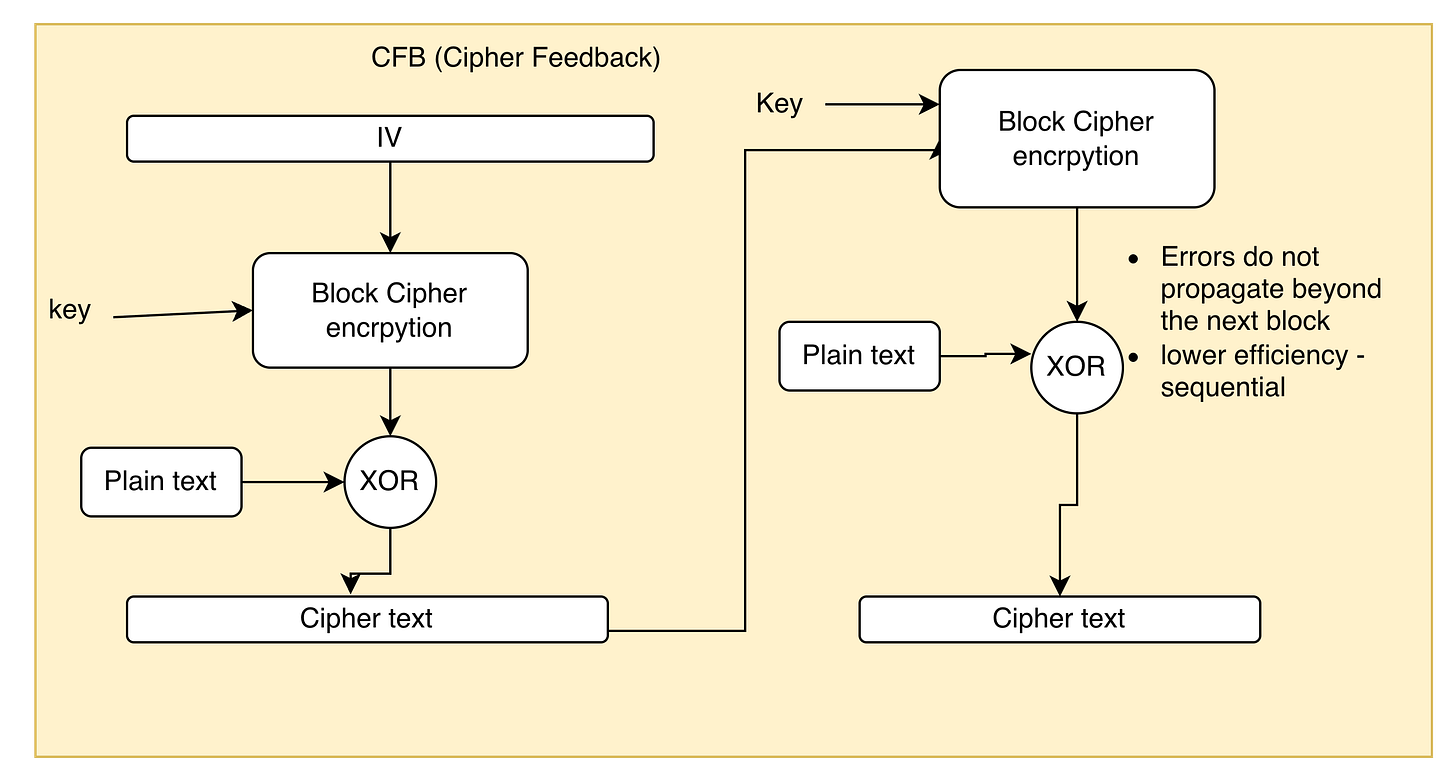 Description: Converts a block cipher into a self-synchronizing stream cipher by feeding ciphertext back into the encryption process.