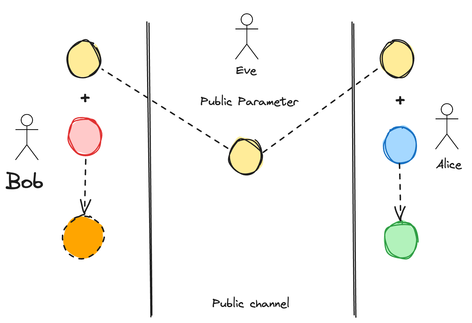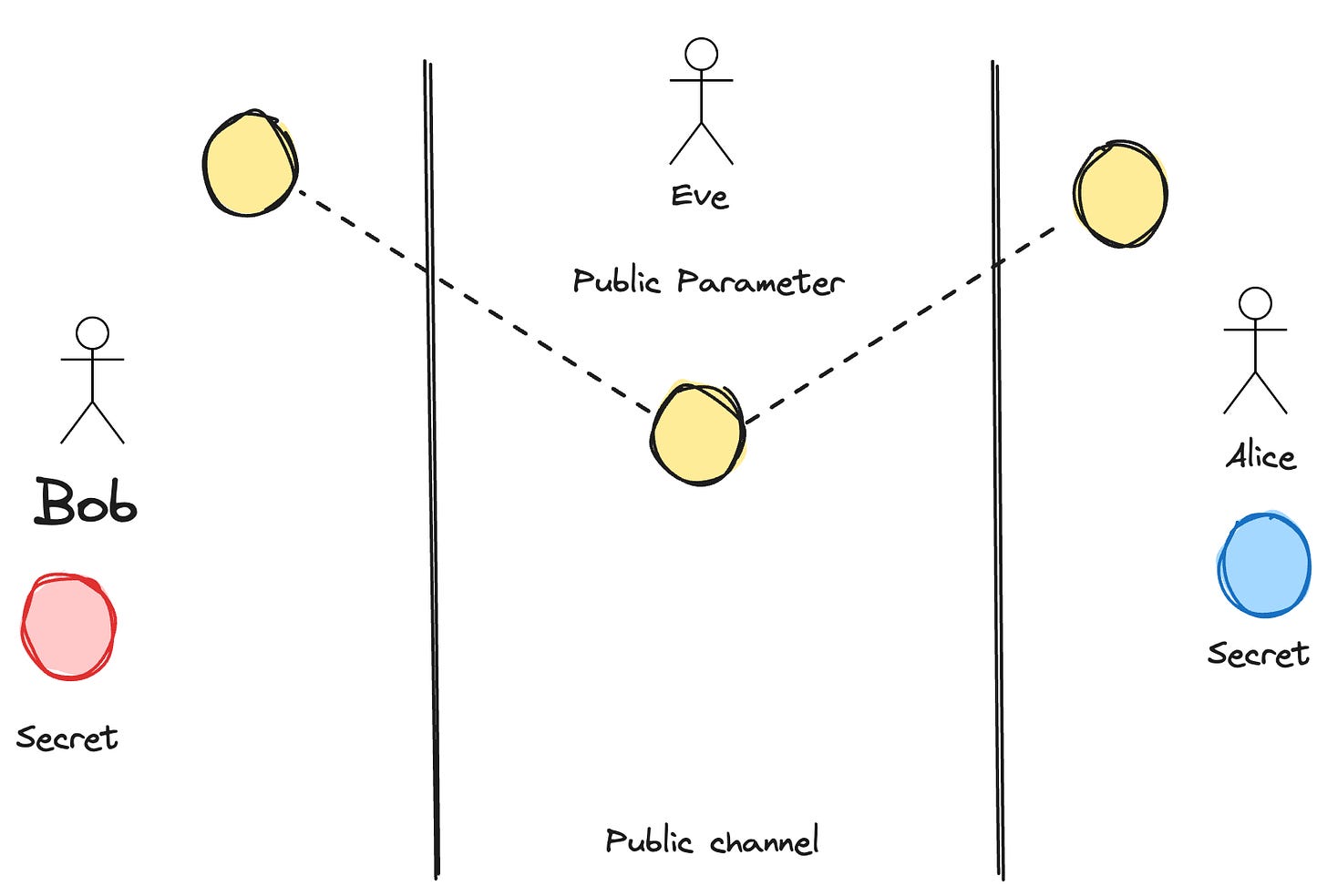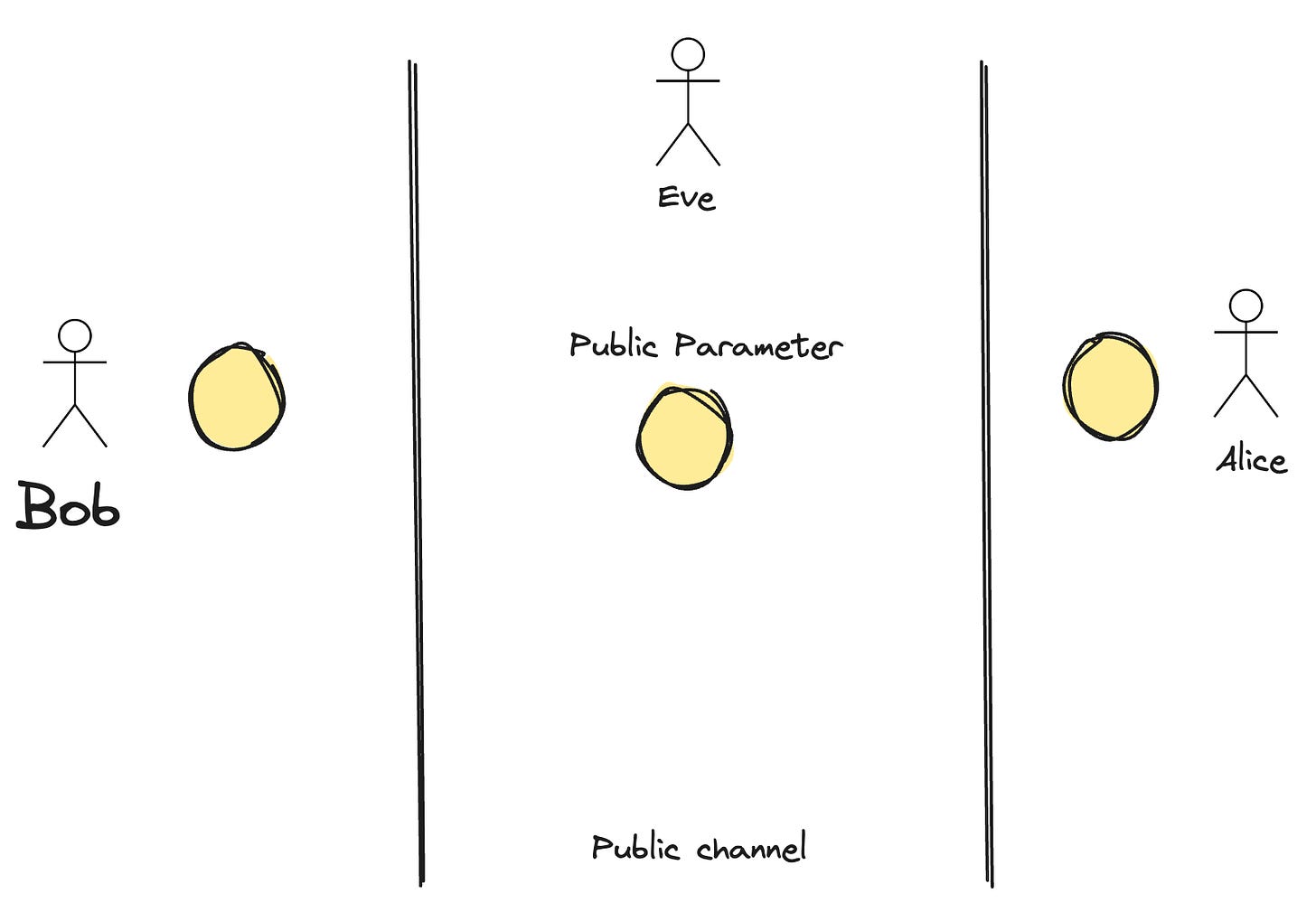 But an attacker (Eve) is watching everything on the public channel.