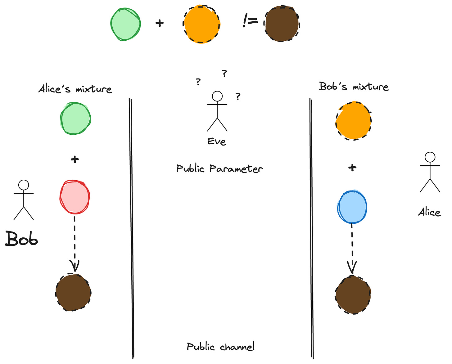 I will explain this algorithm without using complicated mathematical formulas. That isn’t the point here. So instead of a discrete logarithm problem, I am going to use colors!