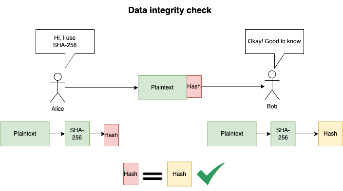 Alice tells Bob which hash function she will use (e.g., SHA-256).